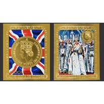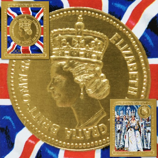 Na znaczkach widnieje królowa w szatach koronacyjnych oraz medal z popiersiem monarchini.