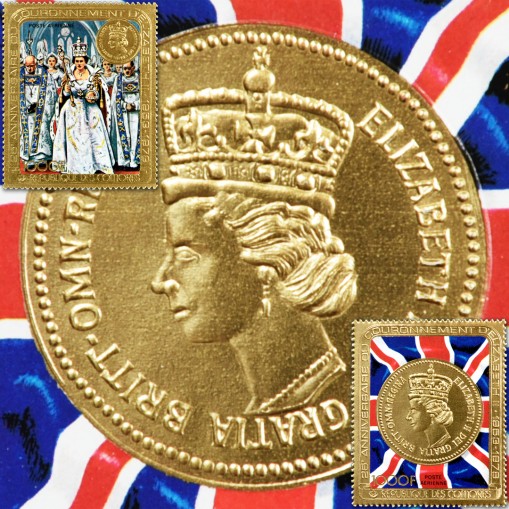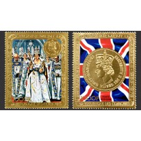 Na znaczkach widnieje królowa w szatach koronacyjnych oraz medal z popiersiem monarchini.
