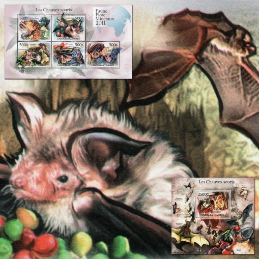 Seria w arkuszu i blok, na znaczkach których widnieją następujące gatunki nietoperzy: