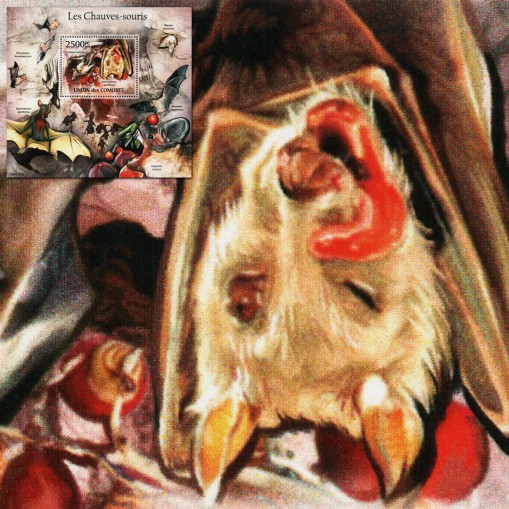 Znaczek w bloku, na którym widnieją nietoperze: zjawa płowa i pagonowiec baobabowy.