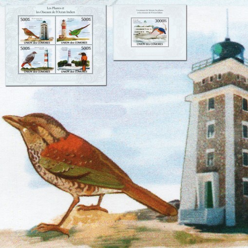 Seria w arkuszu i blok, na znaczkach których widnieją następujące latarnie morskie i gatunki ptaków: