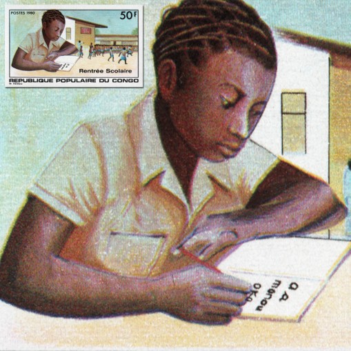 Na znaczku widnieje piszący chłopiec na tle dzieci przed budynkiem szkoły.