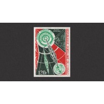 Na znaczku widnieją wieże transmisyjne, satelita i logo Międzynarodowego Związku Telekomunikacyjnego.