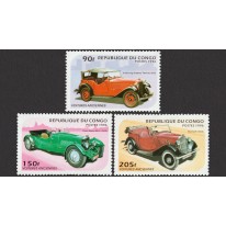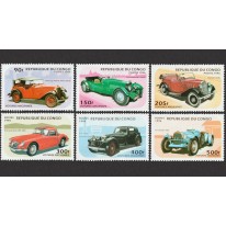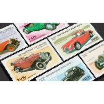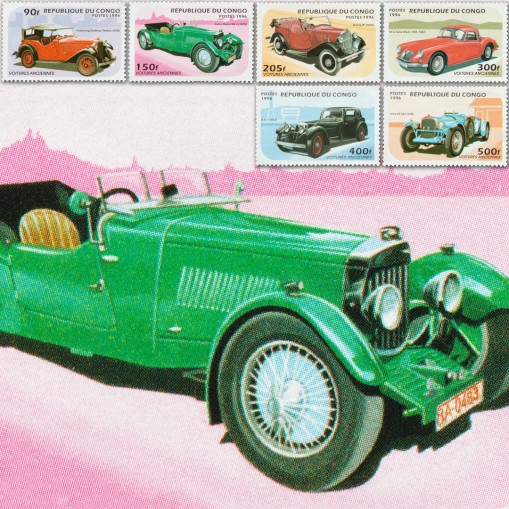 Na znaczkach widnieją klasyczne samochody, kolejno: