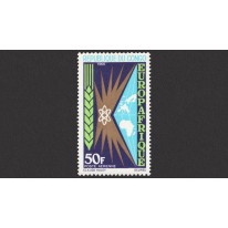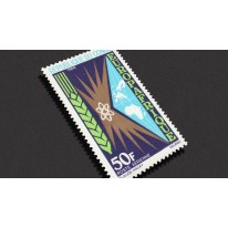 Na znaczku widnieją symbole rolnictwa i energii atomowej oraz mapa świata.