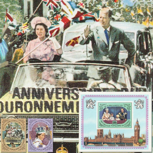 Na znaczkach widnieją kolejno: Elżbieta II i książę Filip podczas wizyty w stolicy Kongo Brazzaville, portret monarchini oraz rodzina królewska na balkonie pałacu Buckingham po zakończeniu ceremonii koronacyjnej.