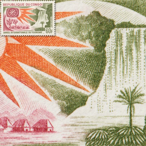 Na znaczku, obok pejzaży z Konga, widnieje logo Międzynarodowego Roku Turystyki - gołąb i słońce na tle kuli ziemskiej otoczonej wieńcem z liści laurowych.