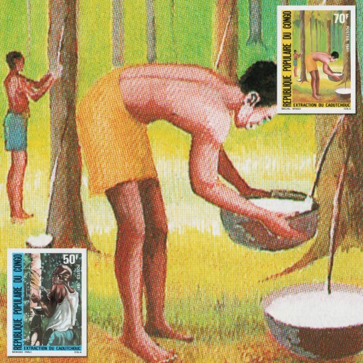 Na znaczkach przedstawiono proces pozyskiwania kauczuku z drzew kauczukowca - nacinanie roślin i zbieranie wypływającego soku.