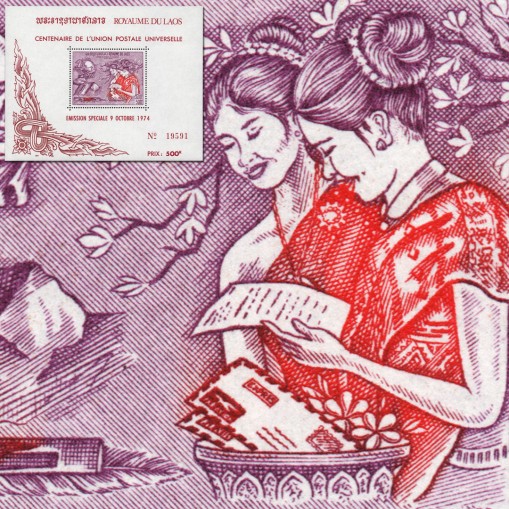 Na znaczku widnieją laotańskie dziewczyny czytające list.