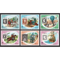 Na znaczkach widnieją stare znaczki i środki transportu poczty.
