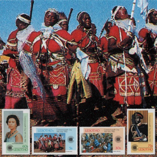 Na znaczkach widnieje tradycyjny taniec Ba-Leseli, tkactwo, królowa Elżbieta II i król Lesotho Moshoeshoe II.