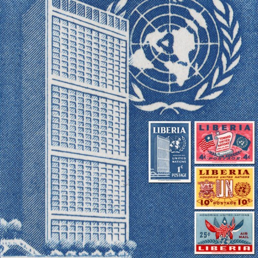 Na znaczkach widnieją kolejno: budynek ONZ w Nowym Jorku, zwój i flagi, herb Liberii i logo ONZ oraz flagi różnych państw.