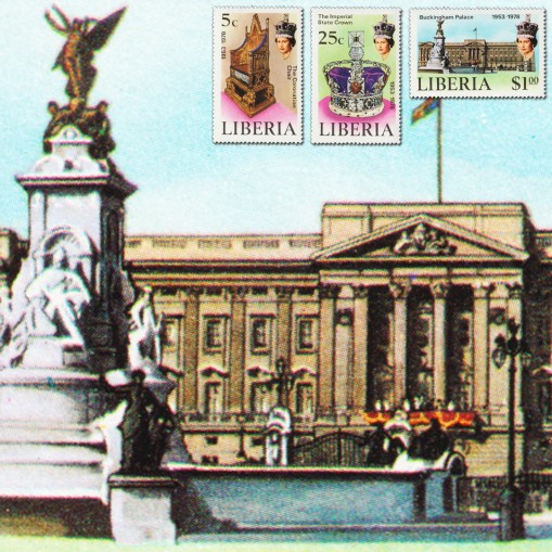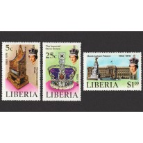 Na znaczkach widnieją kolejno: tron, brytyjska korona państwowa i pałac Buckingham.