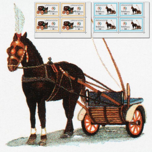 Na znaczkach przedstawiono powozy ciągnięte przez konie.
