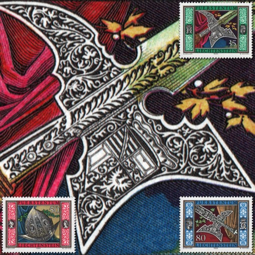 Seria, na znaczkach której widnieje uzbrojenie i zbroja strażników książęcych: halabardy i hełm z XVII wieku.