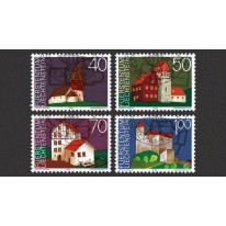 Na znaczkach widnieją kolejno: kościół w Triesen, Czerwony Dom w Vaduz, budynki kościelne w Eschen i zamek Gutenberg w Balzers.