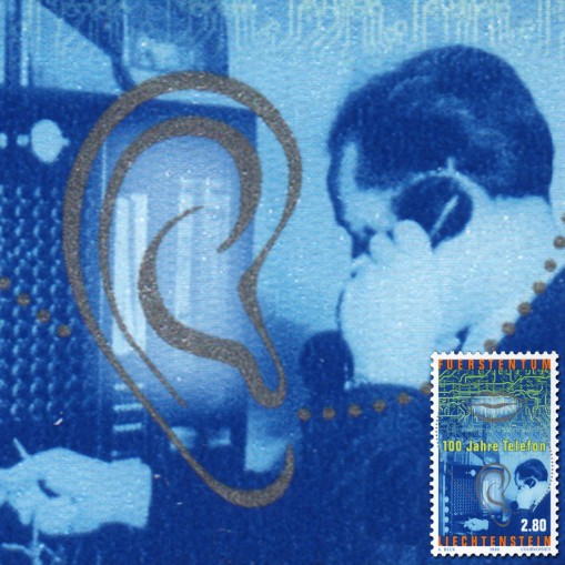 Znaczek upamiętniający stulecie usług telefonicznych w Księstwie Liechtensteinu.