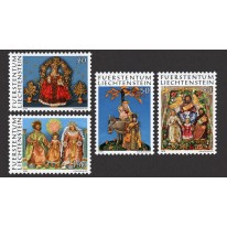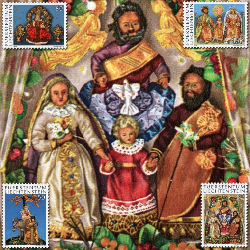 Na znaczkach widnieją wykonywane w klasztorach woskowe figurki przedstawiające postaci biblijne, kolejno: Chrystusa, ucieczkę do Egiptu, Świętą Trójcę i Świętą Rodzinę.