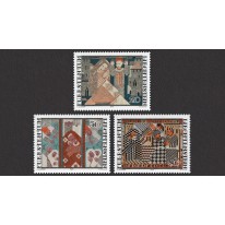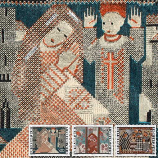 Na znaczkach widnieją hafty Ferdinanda Nigga zatytułowane kolejno: „Zwiastowanie”, „Boże Narodzenie” i „Błogosławieni, którzy wprowadzają pokój”.