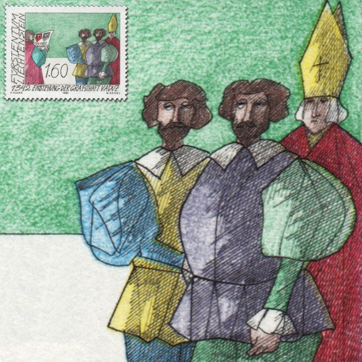 Znaczek upamiętniający 650-lecie historycznego hrabstwa Vaduz.