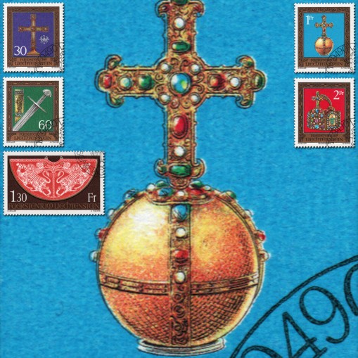 Kasowana grzecznościowo seria, na znaczkach której widnieją skarby z kolekcji cesarskiej w wiedeńskim Hofburgu: krzyż, miecz, jabłko królewskie, szata koronacyjna i korona.