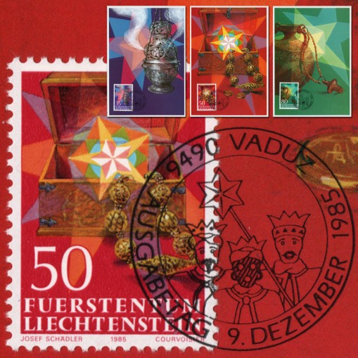 Na znaczkach i kartach widnieje kadzidło, złoto i mirra.