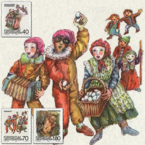 Seria, na znaczkach której widnieją liechtensteińskie zwyczaje karnawałowe, m.in.: pochody i zabawy w przebraniach oraz ognisko.