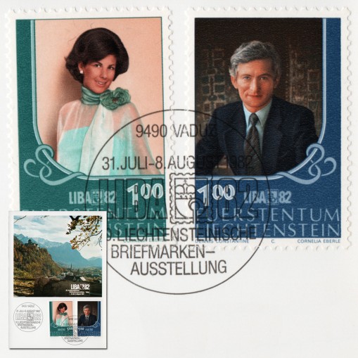 Na znaczkach widnieje para książęca: książę dziedzic Jan Adam II i Marie Aglae Kinsky. Na karcie zaś przedstawiono widok miasta Vaduz z górującym nad nim zamkiem.