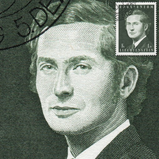 Kasowany grzecznościowo znaczek obiegowy, na którym widnieje książę Jan Adam II Liechtenstein, syn księcia Franciszka Józefa II i Georginy von Wilczek. W 1984 roku ojciec oddał mu rzeczywistą władzę w państwie, mianując go koregentem.