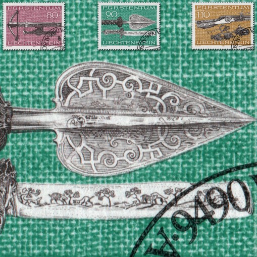 Kasowana grzecznościowo seria prezentująca tradycyjną broń myśliwską: kuszę, włócznię i nóż oraz strzelbę i pojemnik na proch.