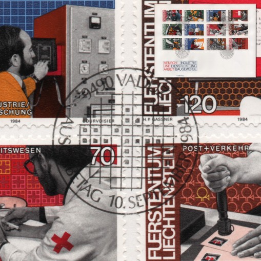 Kasowana grzecznościowo seria obiegowa na kopercie pierwszego dnia obiegu prezentująca ludzi przy pracy w następujących dziedzinach: