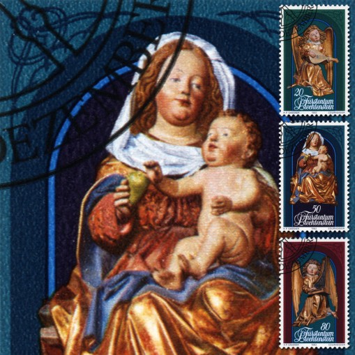 Na znaczkach widnieją rzeźby ze średniowiecznego ołtarza w katedrze w Chur przedstawiające Madonnę z Dzieciątkiem oraz anioły grające na lutni i harfie. Ołtarz jest autorstwa Jakoba Russa i ukończony został w 1492 roku.