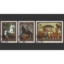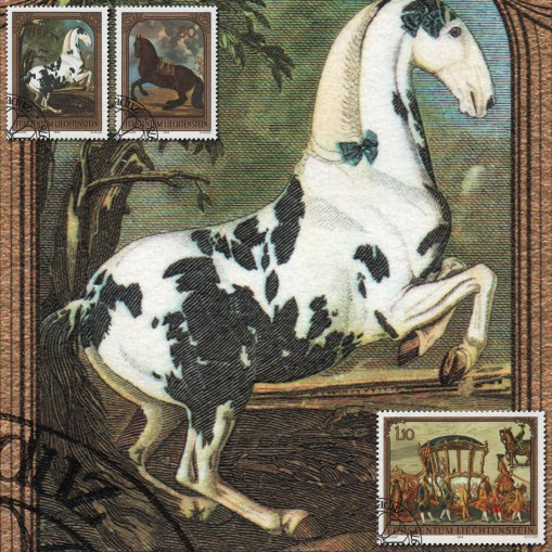Kasowana grzecznościowo seria, na znaczkach której widnieją portrety koni i obraz karety księcia Liechtensteinu Józefa Wacława.