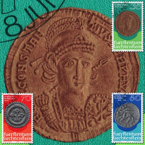 Kasowana grzecznościowo seria, na znaczkach której widnieją monety, kolejno: