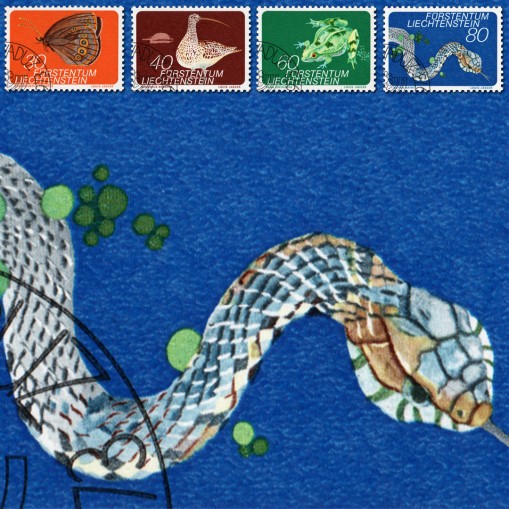Kasowana grzecznościowo, na znaczkach której widnieją przedstawiciele fauny Liechtensteinu: