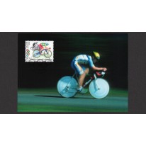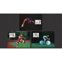 Na znaczkach i kartach widnieją kolejno: gimnastyka, bieg przez płotki i kolarstwo.