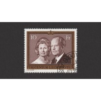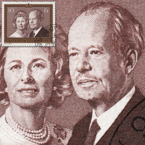 Kasowany grzecznościowo znaczek obiegowy, na którym widnieje książę Liechtensteinu Franciszek Józef II z małżonką Georginą von Wilczek.