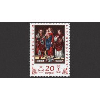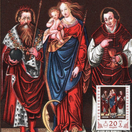 Znaczek obiegowy, na którym widnieje Madonna z Dzieciątkiem w towarzystwie patronów Liechtensteinu: świętego Lucjusz i świętego Florin.
