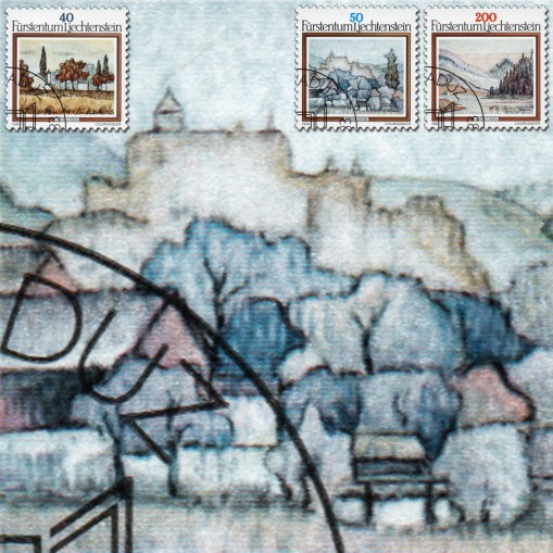 Kasowana grzecznościowo seria prezentująca pejzaże autorstwa Antona Endera przedstawiające kolejno: miejscowość Schaan, Balzers i zamek Gutenberg oraz jezioro Stausee niedaleko Steg.