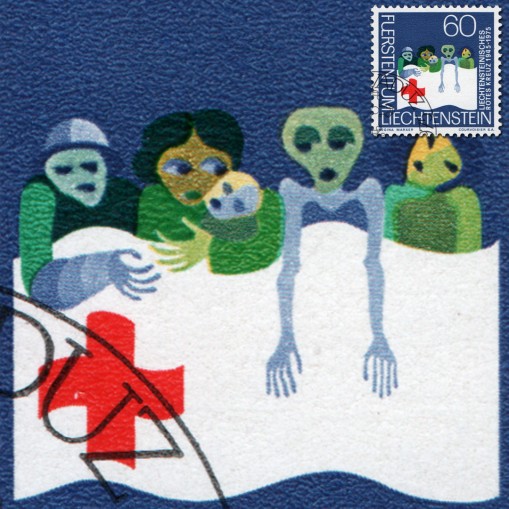 Na znaczku widnieją potrzebujący pomocy i symbol Czerwonego Krzyża.