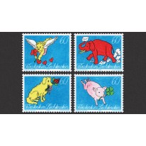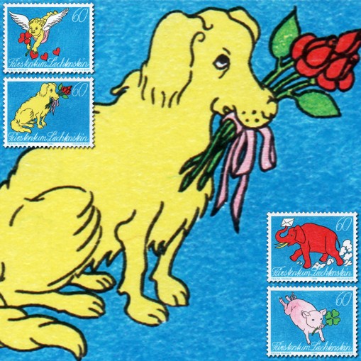 Na znaczkach widnieją kolejno: aniołek z serduszkami, słoń z listem, pies z kwiatami i świnia z czterolistną koniczyną.