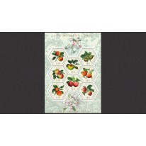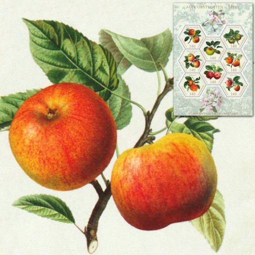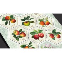 Znaczki w bloku, na których przedstawiono stare odmiany jabłek.