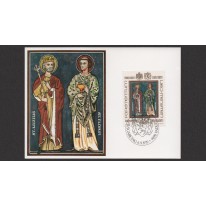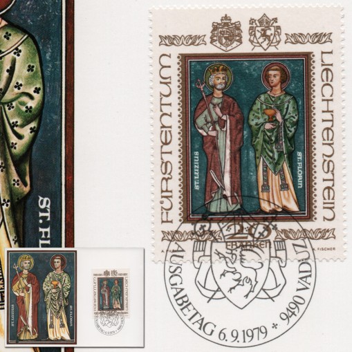 Znaczek obiegowy na karcie maksimum, na którym widnieją święci patroni Liechtensteinu: święty Lucjusz i święty Florin.
