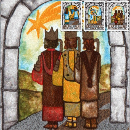 Na znaczkach widnieje zwiastowanie, Święta Rodzina i Trzej Królowie.