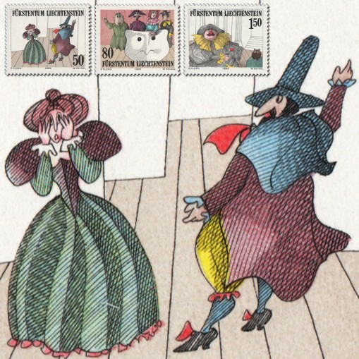 Seria, na znaczkach której widnieją marionetki grające w tragedii, komedii i operze.