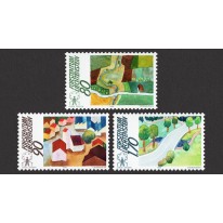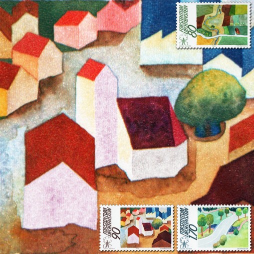 Na znaczkach widnieją pola uprawne, wieś i droga.