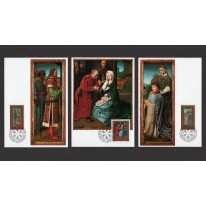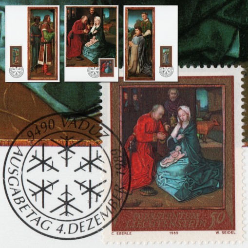 Na znaczkach i kartach widnieją fragmenty tryptyku Hugo van der Goesa przedstawiające Melchiora i Baltazara, Kacpra i Świętą Rodzinę oraz świętego Stefana.