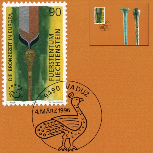 Znaczek na karcie maksimum ukazujący dorobek kultury epoki brązu w Europie.