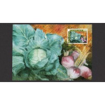 Seria na kartach maksimum prezentująca warzywa: kapustę białą i niebieską oraz buraki, cebulę, czosnek i ziemniaki.