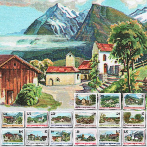 Seria, na znaczkach której przedstawiono widoki liechtensteińskich wiosek, kolejno: Eschen, Planken, Ruggell, Balzers, Ruggell, Nendeln, Eschen, Triesen, Mauren, Schaanwald, Schaan, Gamprin, Triesenberg i zamek Vaduz.